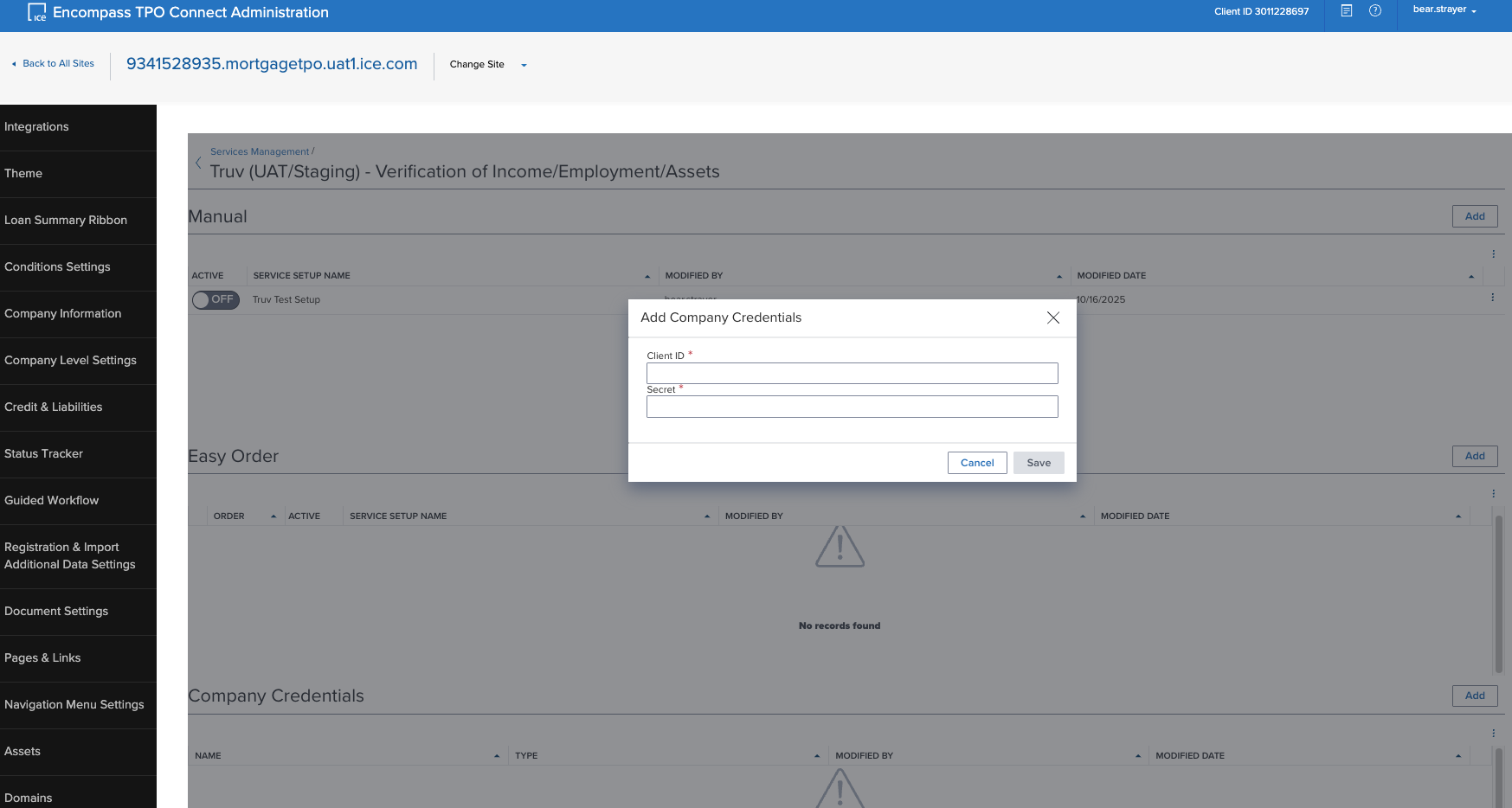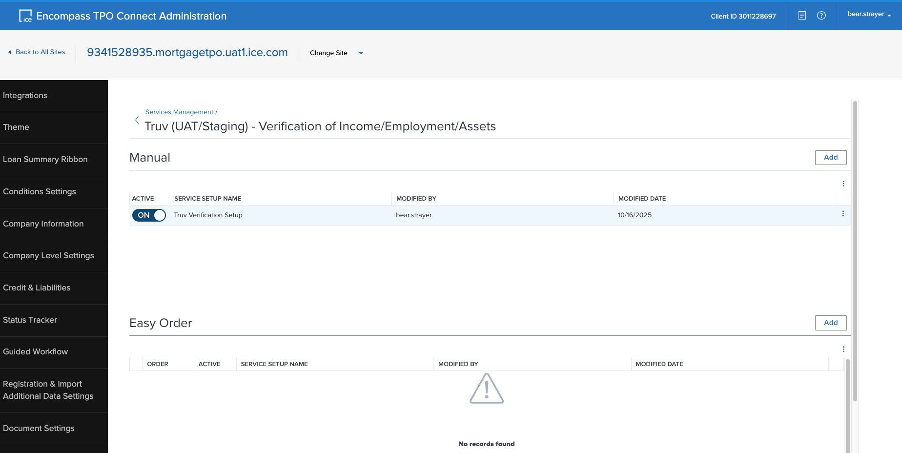 Follow the below guide to setup Truv in Encompass® TPO Connect. If using Truv in both Encompass® TPO Connect and Encompass® LOS, we recommend setting up and testing LOS first (https://docs.truv.com/update/docs/enable-truv-in-ice-encompass#/).