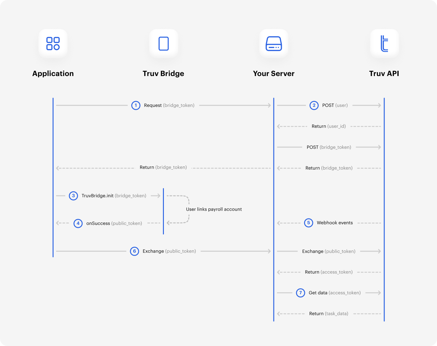 The diagram below shows an overview of token and data exchanges. The sequence covers your application, Truv Bridge, your server and backend, as well as the Truv API. View the Steps section to get started.