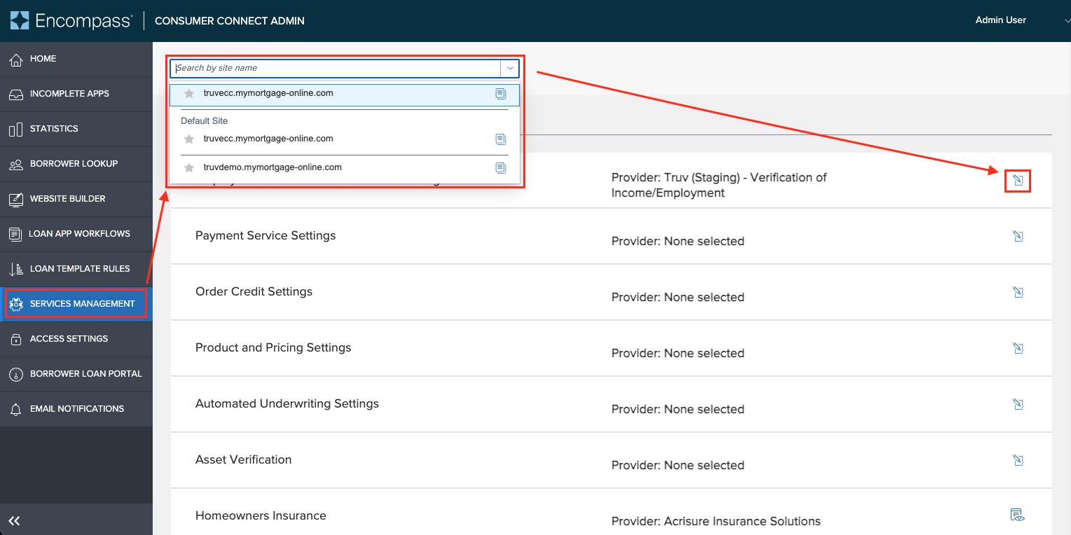 - Select the correct site name in the dropdown where Truv services will be added.