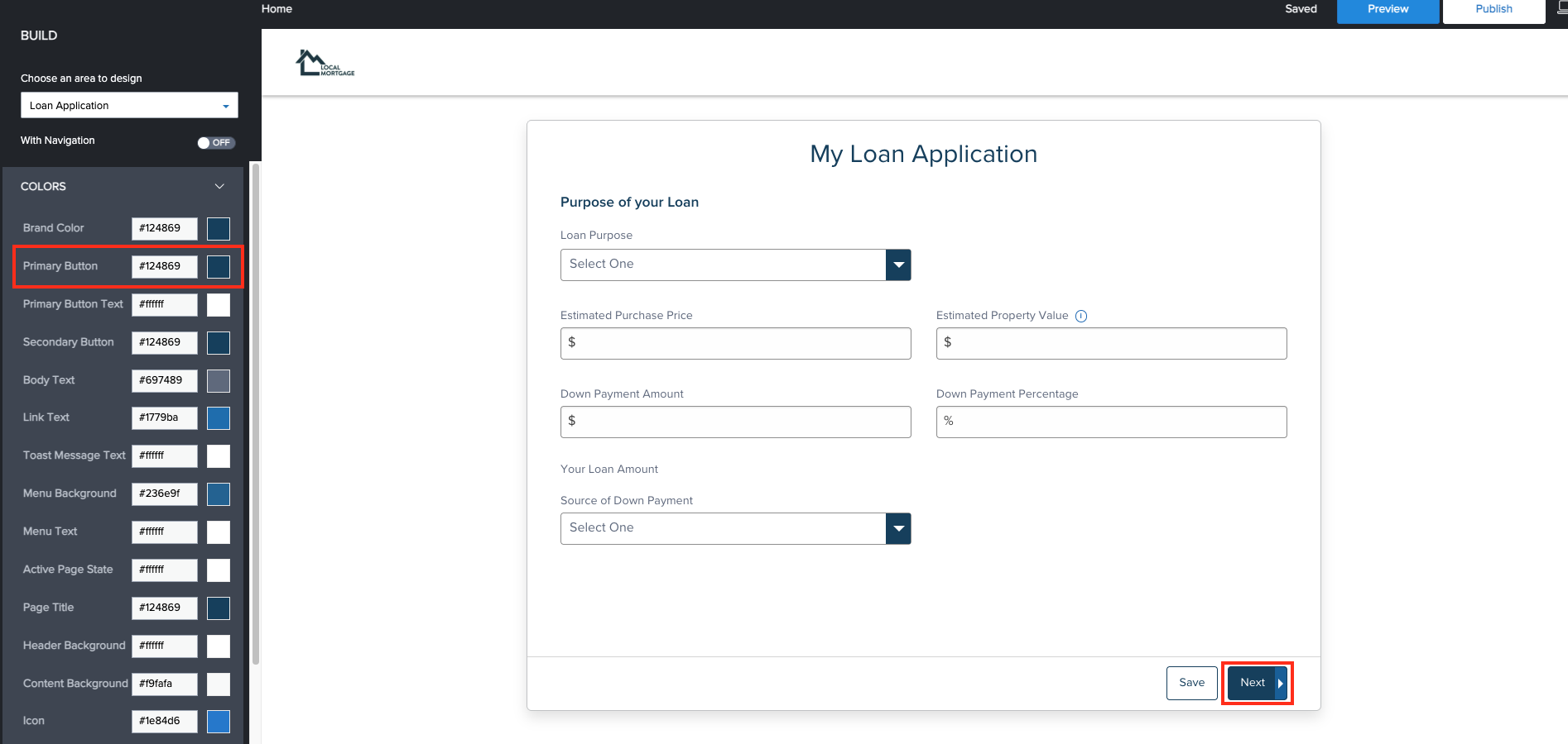 - Set the Accent color to whatever color is used in your ECC Application flow for the Primary Button color. This will ensure the buttons have a consistent look and feel throughout the application flow. This color can be found on the Admin site on the Website Builder tab when editing the Loan Application.