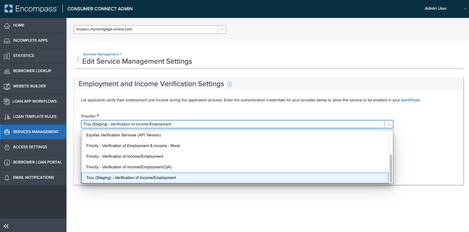 - On the Provider dropdown, select Truv - Verification of Income/Employment/Assets option