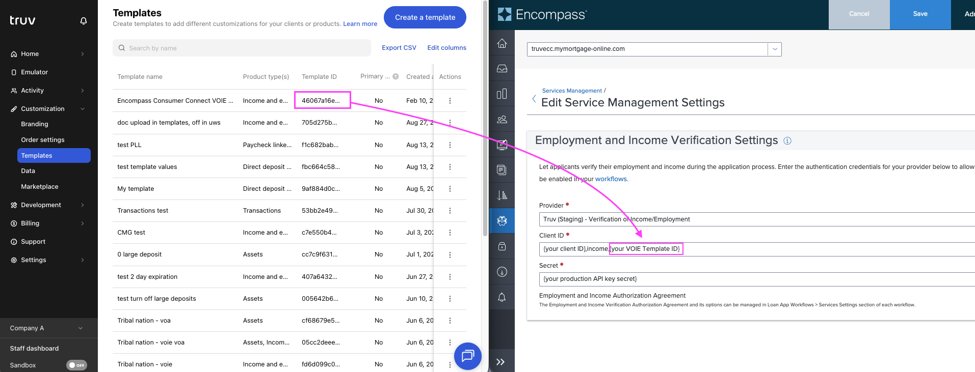 - Template ID can be copied for the template that should be used in ECC from the Customization -> Templates tab of Truv Dashboard.